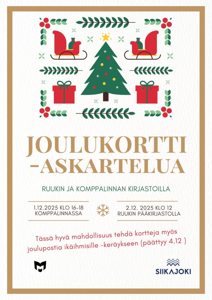 Tervetuloa askartelemaan joulukortteja Ruukin pääkirjastoon. Voit samalla valmistaa myös kortteja Joulupostia ikäihmiselle -keräykseen.
