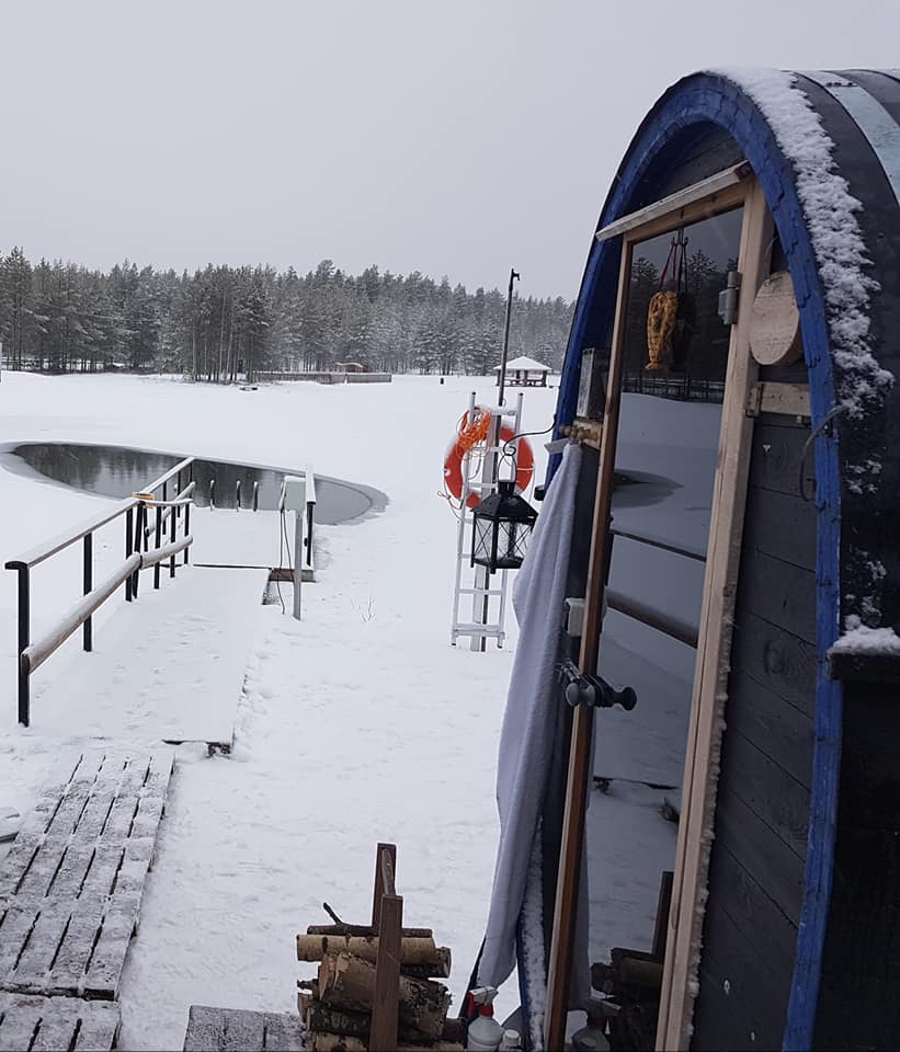 Lammen Reijo tuo oman tynnyrisaunansa paikalle, (vapaaehtoinen saunamaksu saunamajurille). Tuomiston Pirkko ja Reijo opastavat tarvittaessa avantouinnin saloihin.