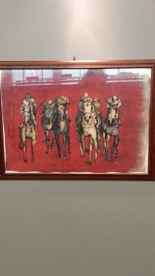 Timo Jaakolan hevosmaalauksia kirjaston näyttelytilassa.