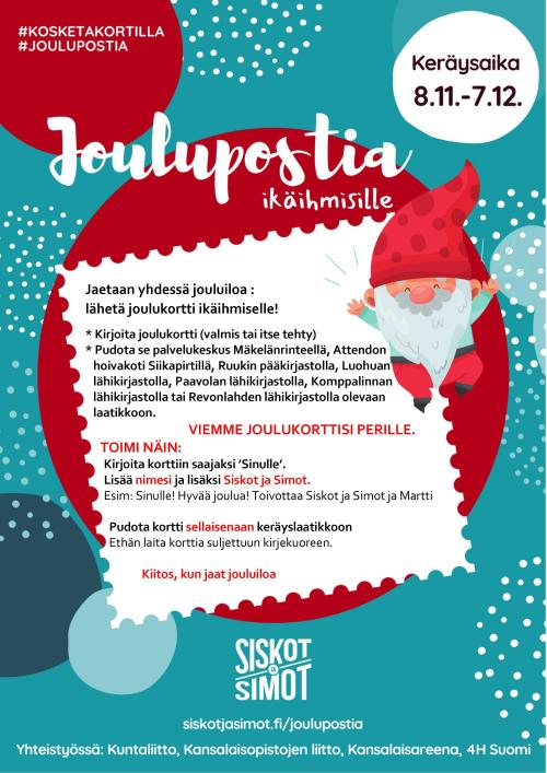 Luovan välittämisen yhteisö Siskot ja Simot ry järjestää 8.11.–7.12.2021 valtakunnallisen Joulupostia ikäihmisille -kampanjan, jossa kerätään joulukortteja kotihoidon ja asumispalvelujen ikääntyneille asiakkaille.