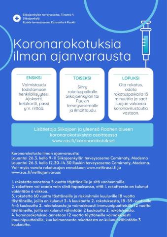 Lauantaina 26.3 koronarokotuksia (Comirnaty, Moderna) ilman ajanvarausta Ruukin terveysasemalla klo 12.30-14.30. Valmistaudu todistamaan henkilöllisyytesi ilmoittautuessasi.