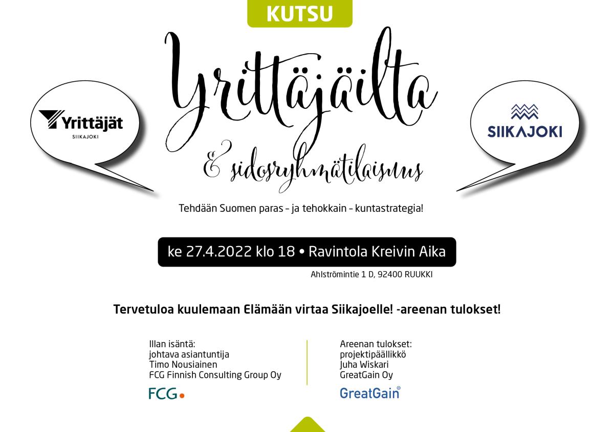 Elämään virtaa Siikajoelle! -areenan tulokset ovat valmiina ja niistä tulee kertomaan projektin vetovastuussa ollut Juha Wiskari GreatGain Oy:stä. Illan isäntänä toimii johtava asiantuntija Timo Nousiainen FCG:stä.