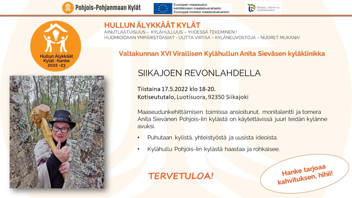 Maaseudunkehittämisen toimissa ansioitunut, monitalentti ja tomera Anita Sievänen Pohjois-Iin kylästä on käytettävissä juuri teidän kylänne avuksi.
