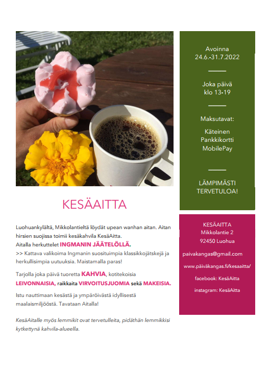 Luohuan KesäAitalla hurmaava kesäkahvila 24.6.-31.7. joka päivä klo 13-19