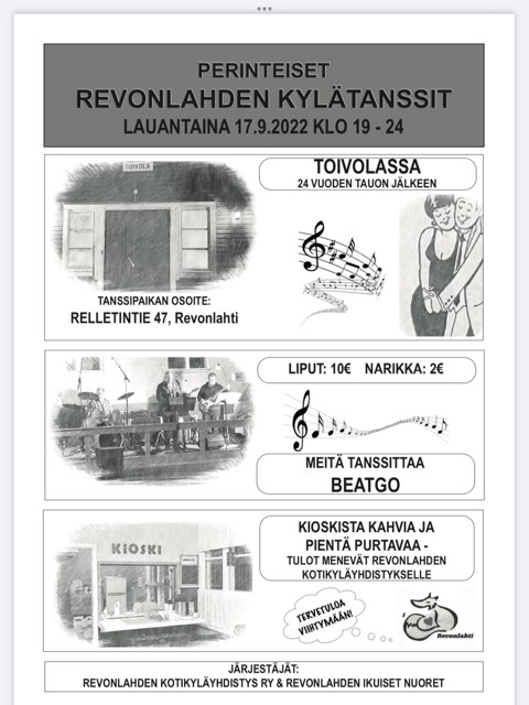 Perinteiset Revonlahden kylätanssit lauantaina 17.9.2022 klo 19-24 Toivolassa.