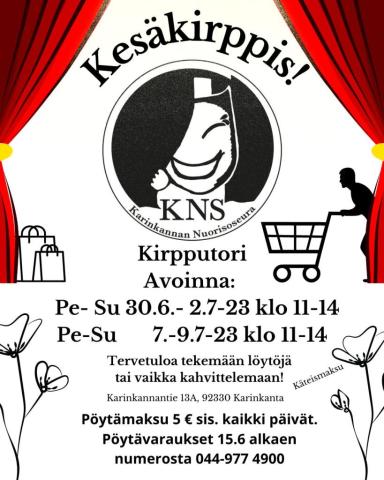 Kirpputori avoinna: Pe-Su 20.6. - 2.7.23 klo 11 - 14 sekä Pe-Su 7. - 9.7.23 klo 11 - 14.