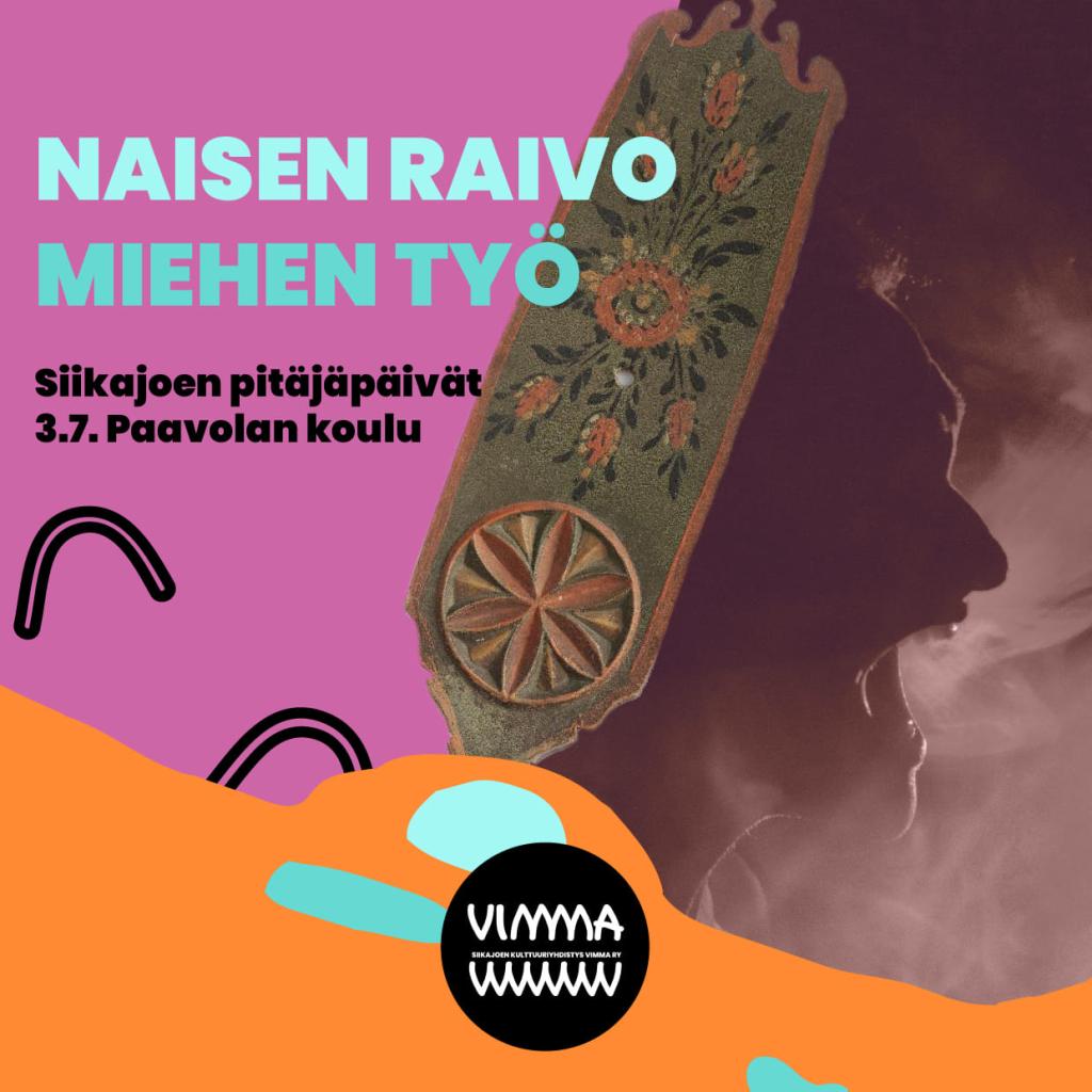 Siikajoen kulttuuriyhdistys Vimma järjestää ma 3.7. yhteisöllisen taidetapahtuman Paavolan koululla klo 15-18.00 osana pitäjäpäiväviikon ohjelmaa. Naisen raivo ja miehen työ klo 16.00 alkaen.