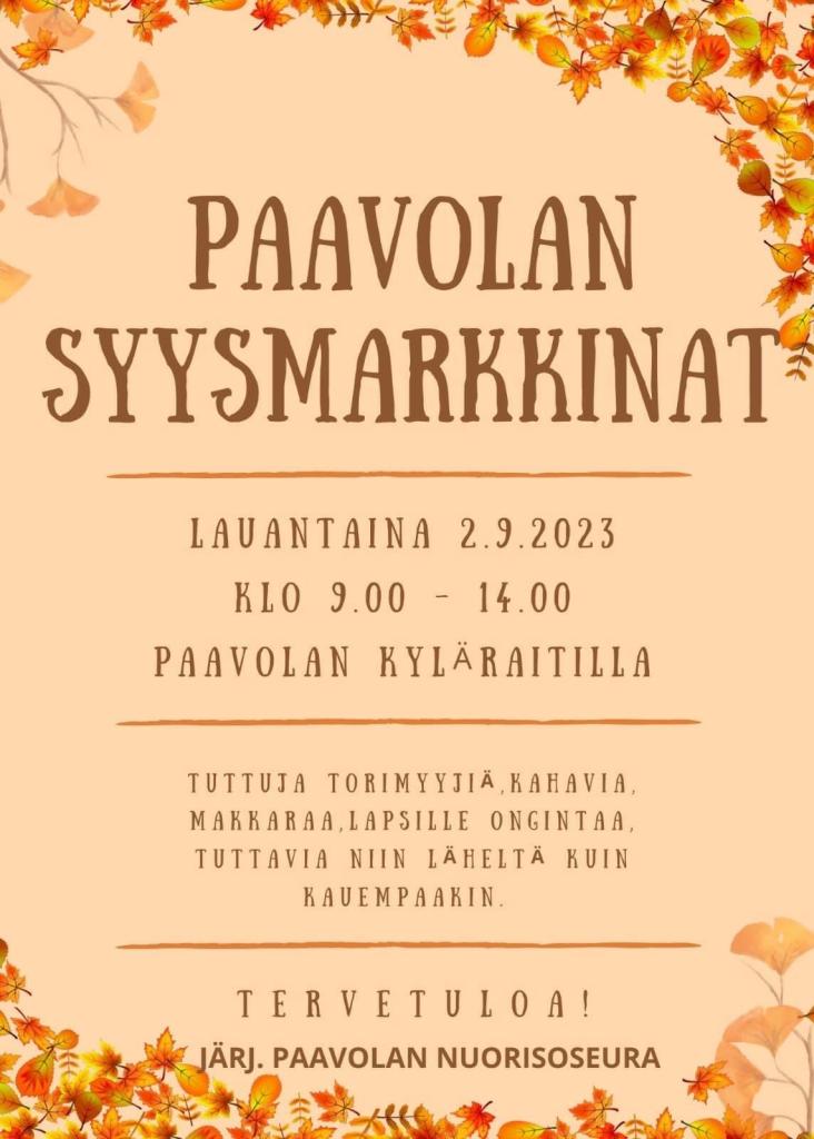 Perinteiset Paavolan syysmarkkinat lauantaina 2.9.2023 klo 9.00 - 14.00 Paavolan kyläraitilla.