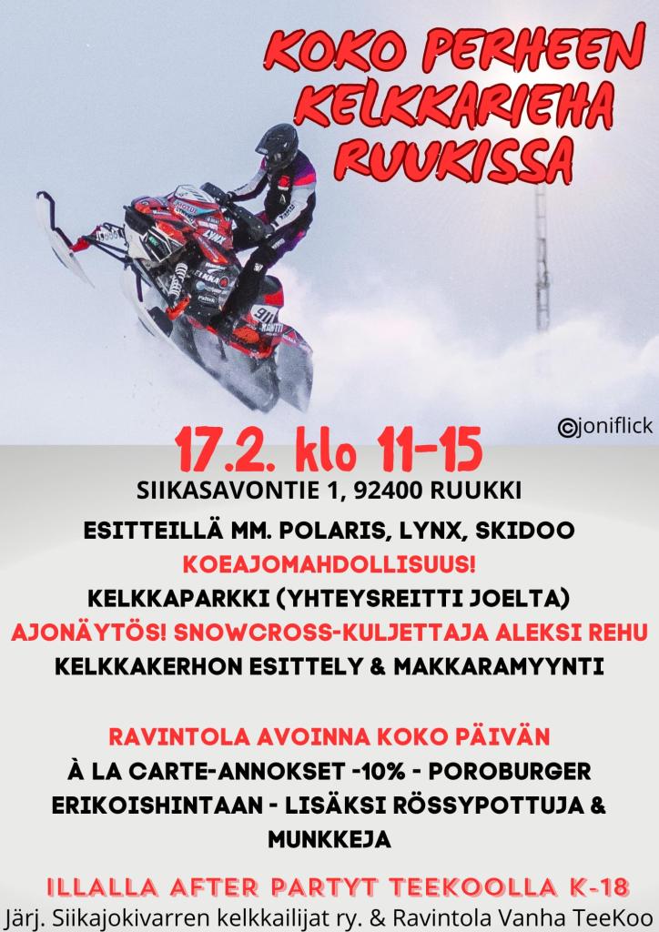 Koko perheen kelkkarieha. Näytösajoa, uusien kelkkojen koeajo mahdollisuus, makkaraa, burgereita, rössypottuja yms yms.