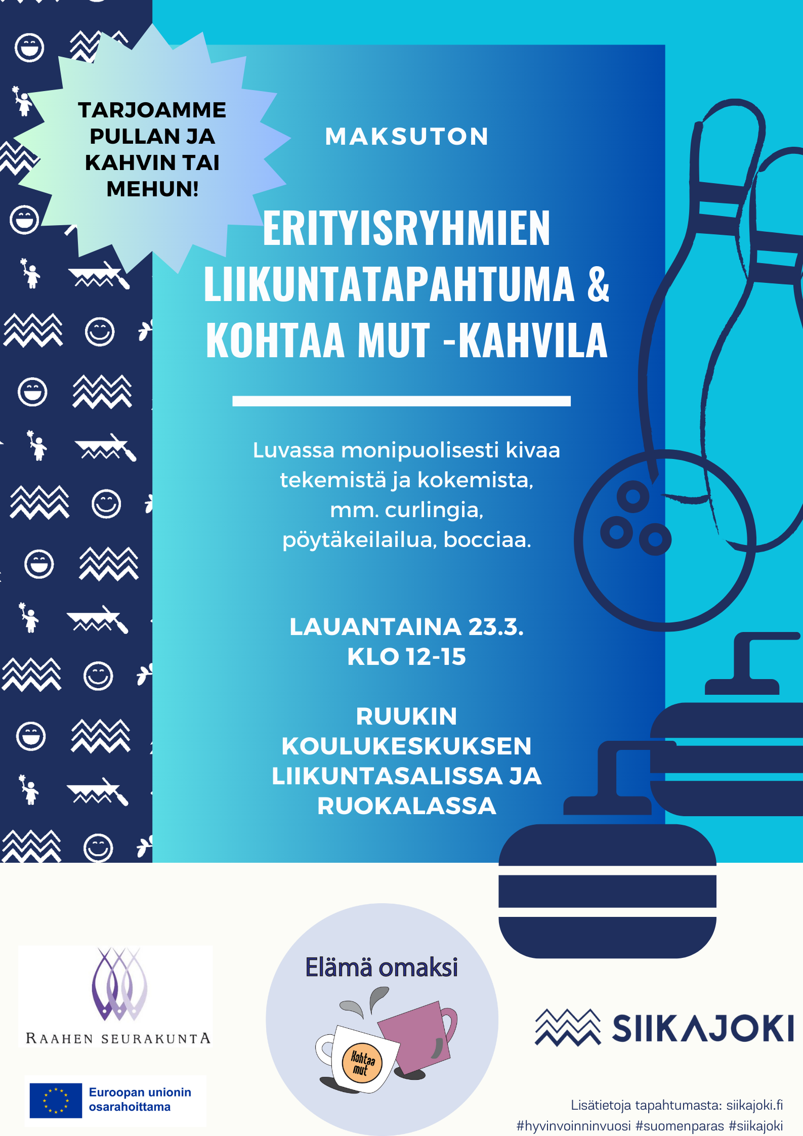 Siikajoen kunta järjestää yhteistyössä Kehitysvammaisten tukiliiton ja Raahen seurakunnan kanssa maksuttoman erityisryhmien liikuntatapahtuman ja Kohtaa mut-kahvilan lauantaina 23.3.2024 klo 12-15 Ruukin koulukeskuksen liikuntasalissa ja ruokalassa, osoitteessa Opintie 1, 92400 Ruukki.