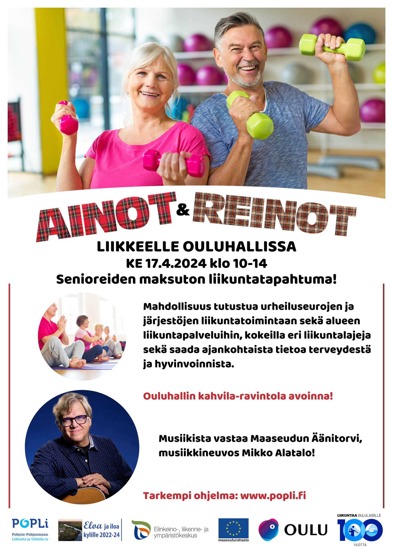 Lisätietoja tapahtumasta löytyy https://www.popli.fi/tapahtumat/ainot-ja-reinot-liikkeelle-ouluhall-3/