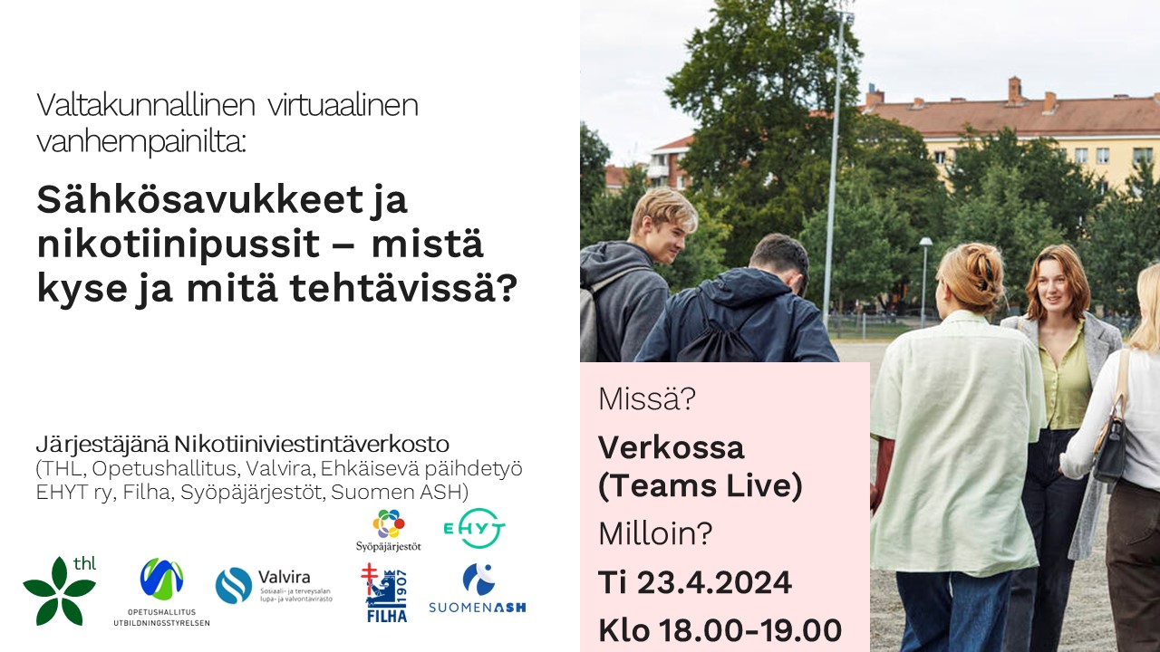 Tapahtuman teksti ja tiedot on lainattu THL:n verkkosivuilta https://thl.fi/ajankohtaista/tapahtumat/tapahtumakalenteri/2024-04-23/valtakunnallinen-virtuaalinen-vanhempainilta-sahkosavukkeet-ja-nikotiinipussit-mista-kyse-ja-mita-tehtavissa-.