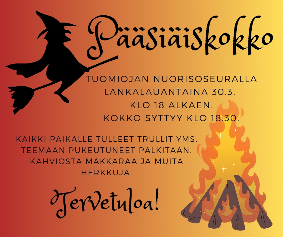 Perinteinen ja maakunnan mahtavin PÄÄSIÄISKOKKO poltetaan Tuomiojan Nuorisoseuralla lankalauantaina 30.3.2024