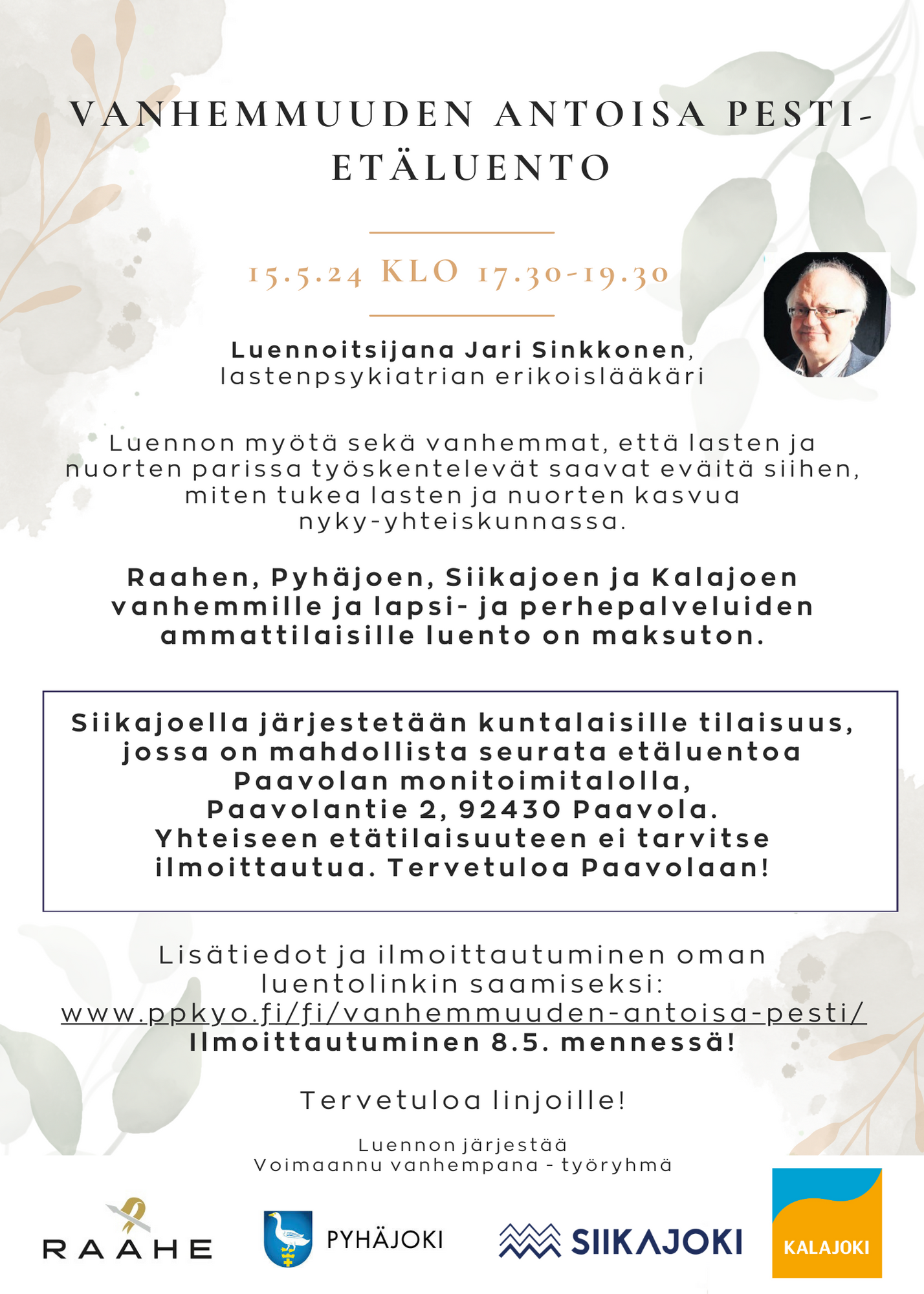 Raahen, Pyhäjoen, Siikajoen ja Kalajoen vanhemmille ja lapsi- ja perhepalveluiden ammattilaisille luento on maksuton.
