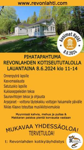 Pihatapahtuma Revonlahden kotiseututalolla ”Avoimet kylät”-päivänä 8. kesäkuuta 2024 klo 11-14.