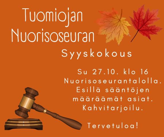 Tuomiojan Nuorisoseura ry.:n syyskokous pidetään 27.10. klo 16 Tuomiojan nuorisoseuralla.