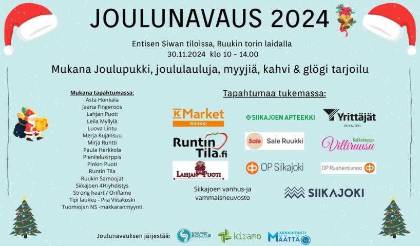 Joulunavaus entisen Siwan tiloissa, Ruukin Torin laidalla 30.11.2024 klo 10-14. Luvassa jouluohjelmaa, myyjiä, kahvi & glögi tarjoilu.