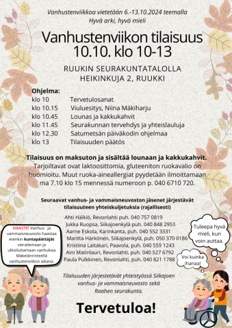 Siikajoen vanhus- ja vammaisneuvosto yhdessä Raahen seurakunnan kanssa järjestävät vanhustenviikon tilaisuuden Ruukin seurakuntatalolla 10.10. klo 10-13.