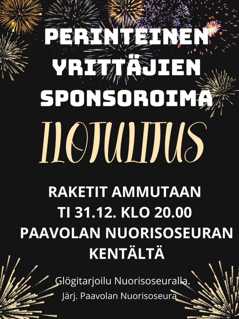 Raketit ammutaan tiistaina 31.12.2024 klo 20.00, Paavolan nuorisoseuran kentältä. Paavolan nuorisoseuralla luvassa myös glögitarjoilua.