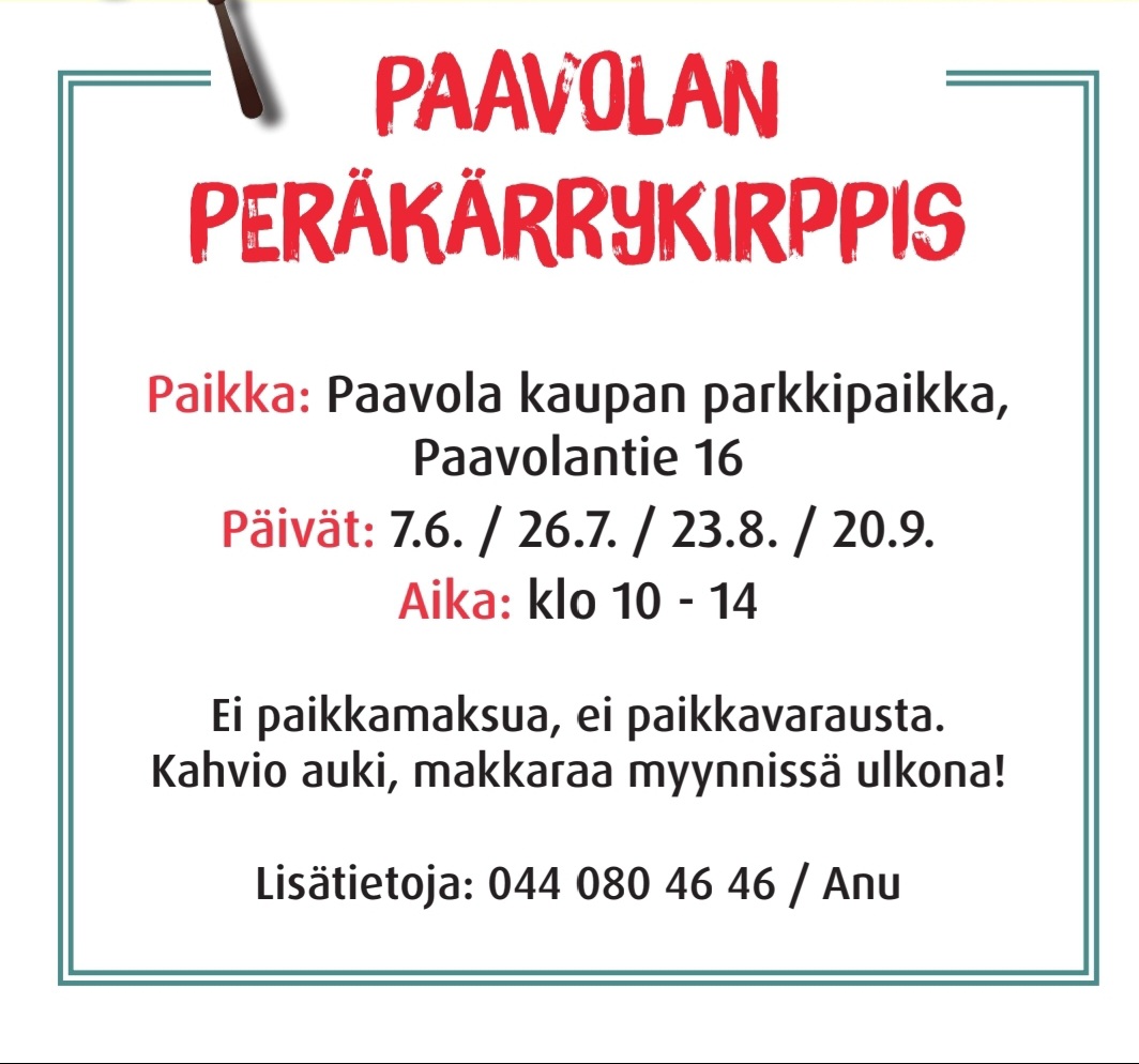 Peräkärrykirppis vielä kolmena (3) lauantaina Paavolan kaupan parkkipaikalla.