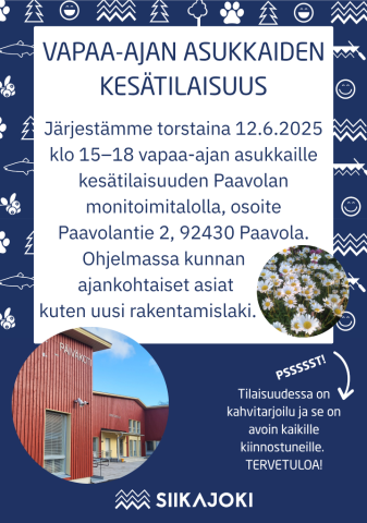 Järjestämme torstaina 12.6.2025 klo 15 - 18 vapaa-ajan asukkaille kesätilaisuuden Paavolan monitoimitalolla.