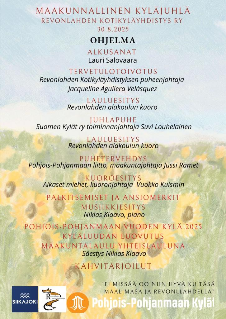 Hei! Olette lämpimästi tervetulleita Siikajoen kunnan, Revonlahden kylän maakunnalliseen kyläjuhlaan. Juhlimme yhdessä Revonlahden kylän valintaa Pohjois-Pohjanmaan Vuoden kyläksi 2023. Samalla julkistetaan Pohjois-Pohjanmaan Vuoden kylä 2025.